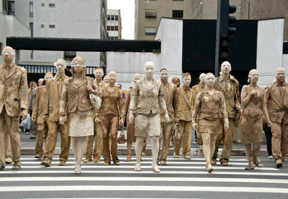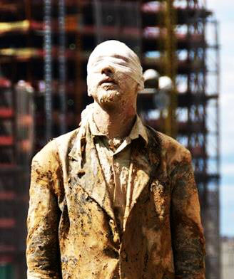 Vários performres vestidos com roupas sociais, de olhos vendados por gazes e com os corpos inteiramente cobertos de argila. O performer participou das realizações dessa ação nos arredores da Lapa-RJ em parceria com o Coletivo Heróis do Cotidiano (UFRJ), como parte do espetáculo “ACORDES” (Teatro OFICINA Uzyna Uzona-Bexiga-SP do Zé Celso Martinês) na estreia e nos arredores da Av. Paulista-SP.