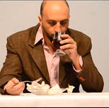 Inspirado pelo dito popular: “Você é aquilo que você come” o performer faz um banquete onde o prato principal são passagens de vários livros do filósofo alemão cujo o nome faz parte do título da ação. O performer literalmente come esses pedaços com garfo e faca seguido de um bom vinho. Também investigando aqui as relações do corpo/dor em detrimento de algum dispositivo físico (pedaços de papéis) e, neste caso, dentro de um jogo (comê-los literalmente) para alcançar uma atmosfera e levar o corpo a um estado extra cotidiano.